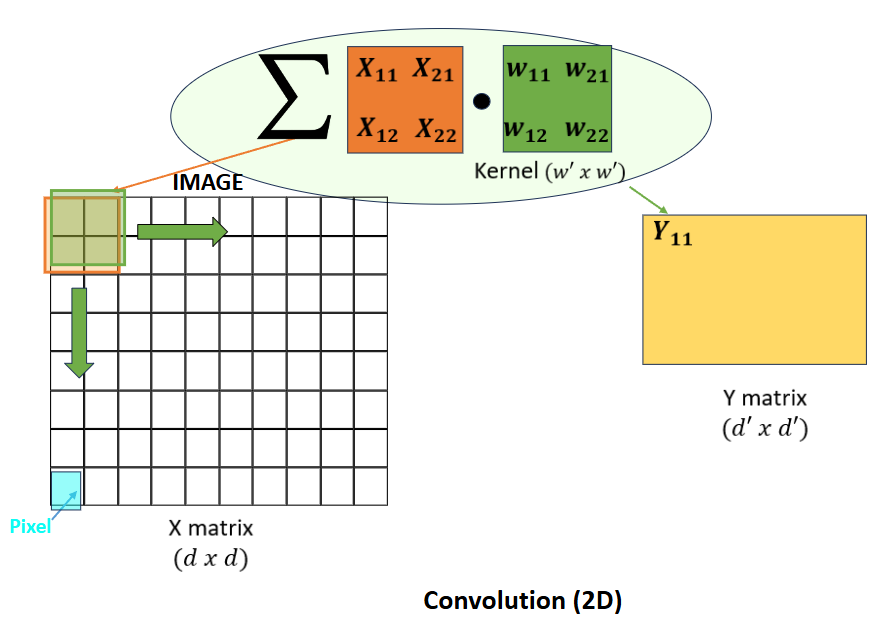 When we are performing convolution in machine learning, we are usually talking about 2-D convolution on images. Here, rather than a vector, our kernel now takes the form of a \(w' * w'\) matrix \(W\) which we slide over the \(d * d\) input, taking the summation over the inner product of weights and entries, producing a \(d' * d'\) output.