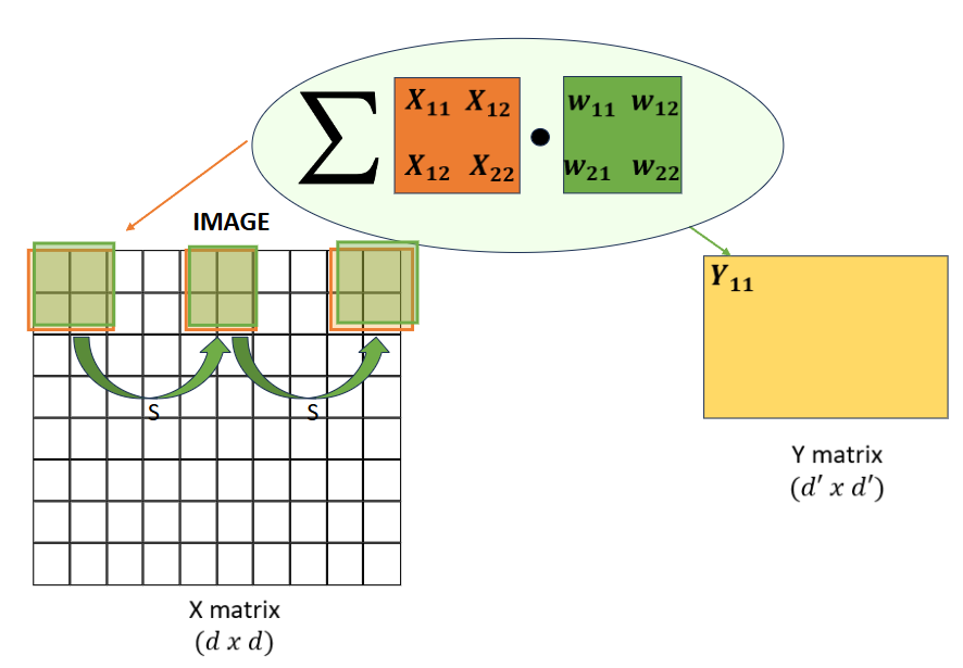 We can set our stride to be some value \(s\), such that our kernel will move by \(s\) entries when taking the summation over the inner product of input/kernel entries and weights. Increasingly large strides in convolution reduce the size of the spatial dimensions of the output.