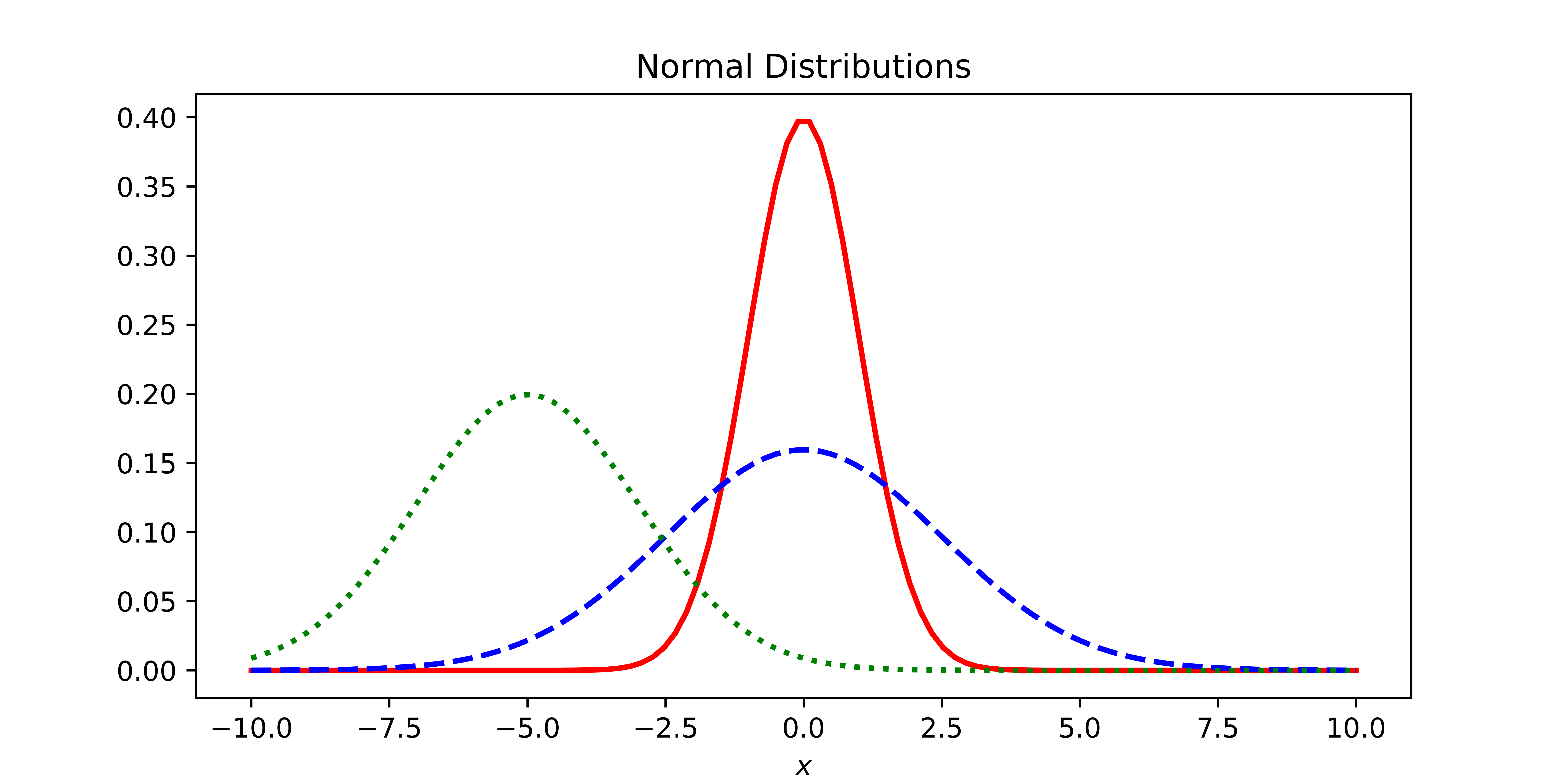 The expected value tells us where the random variable is on average but we’re also interested in how closely the random variable concentrates around its expectation. The variance of a random variable is \[ \textrm{Var}[X] = \mathbb{E}\left[(X - \mathbb{E}[X])^2\right]. \] Notice that the variance is larger when the random variable is often far from its expectation. In the figure below, can you identify the expected value for each of the three distributions? Which distribution has the largest variance? Which has the smallest?