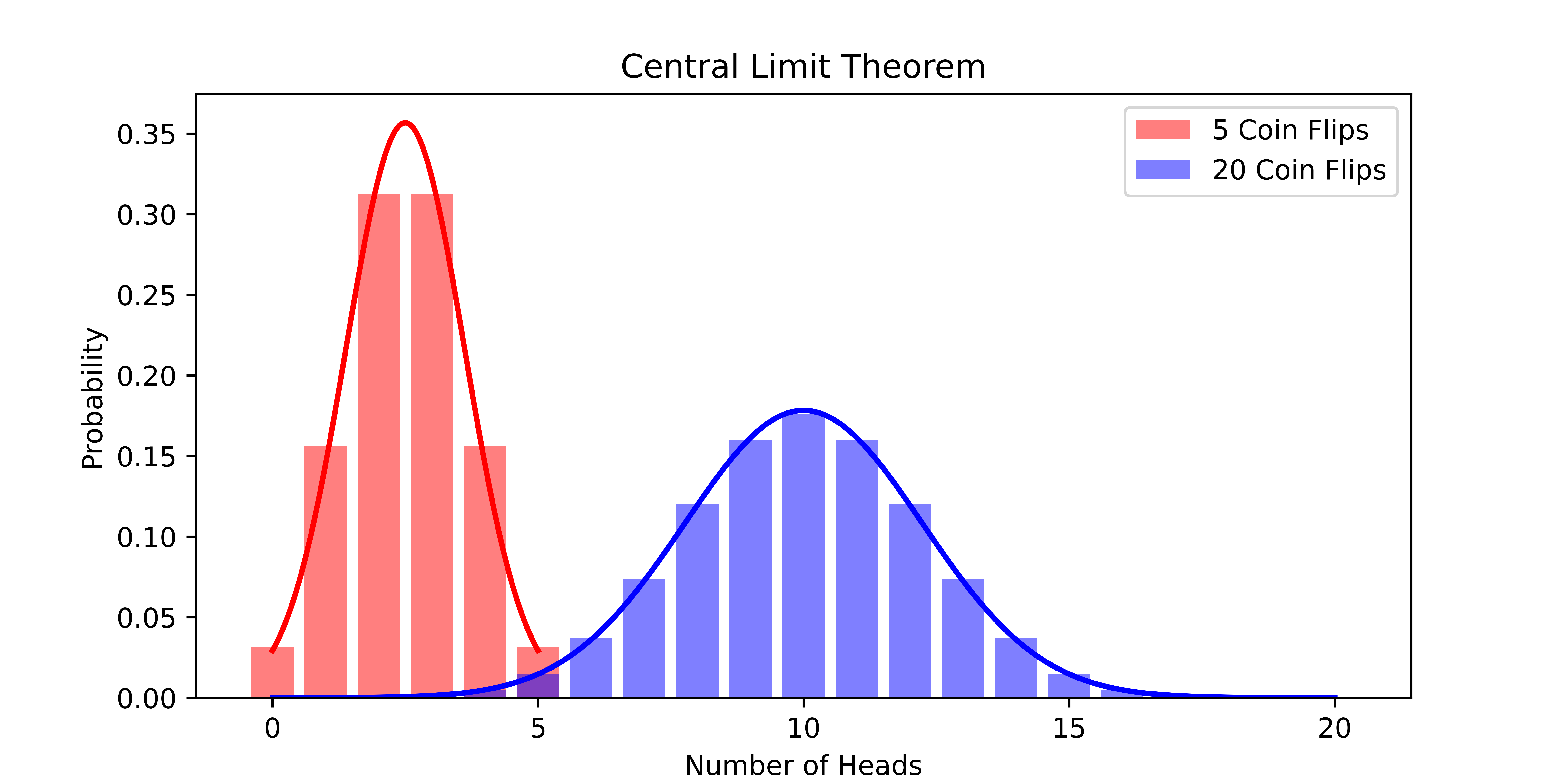 Let’s consider the central limit in the context of the coin flip example. The figure below shows how closely the sum of \(n\) coin flips is approximated by the corresponding Gaussian distribution. As \(n\) increases, the approximation gets better and better.