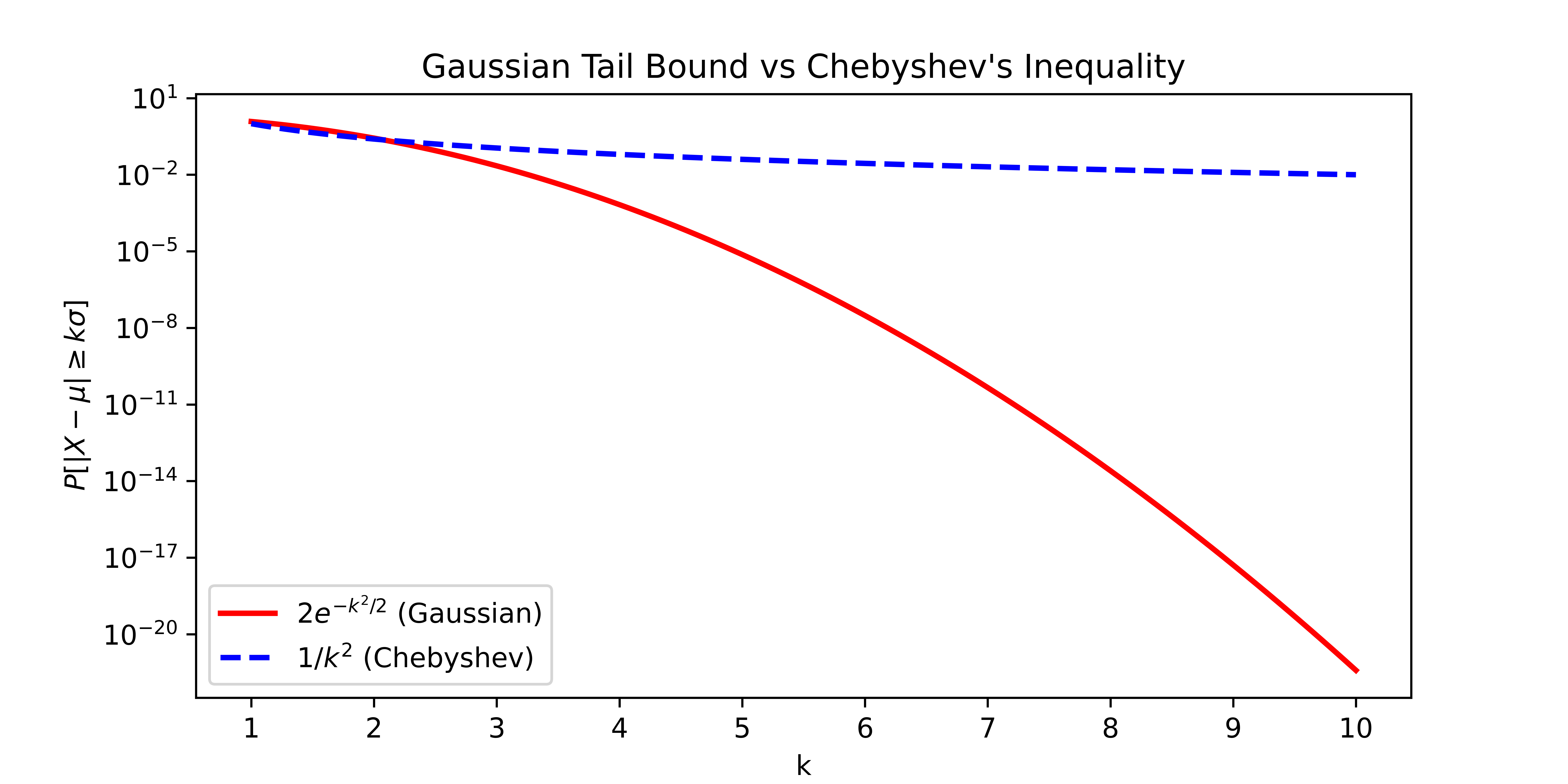 Comparing the Gaussian tail bound to Chebyshev’s inequality, we see that the Gaussian Tail Bound is exponentially better. Let’s see the difference graphically in the figure below. (Notice that the vertical access is on a logarithmic scale.) By \(10\) standard deviations above the mean, the Gaussian tail bound gives a bound that is 18 orders of magnitude smaller than the bound from Chebyshev’s inequality!