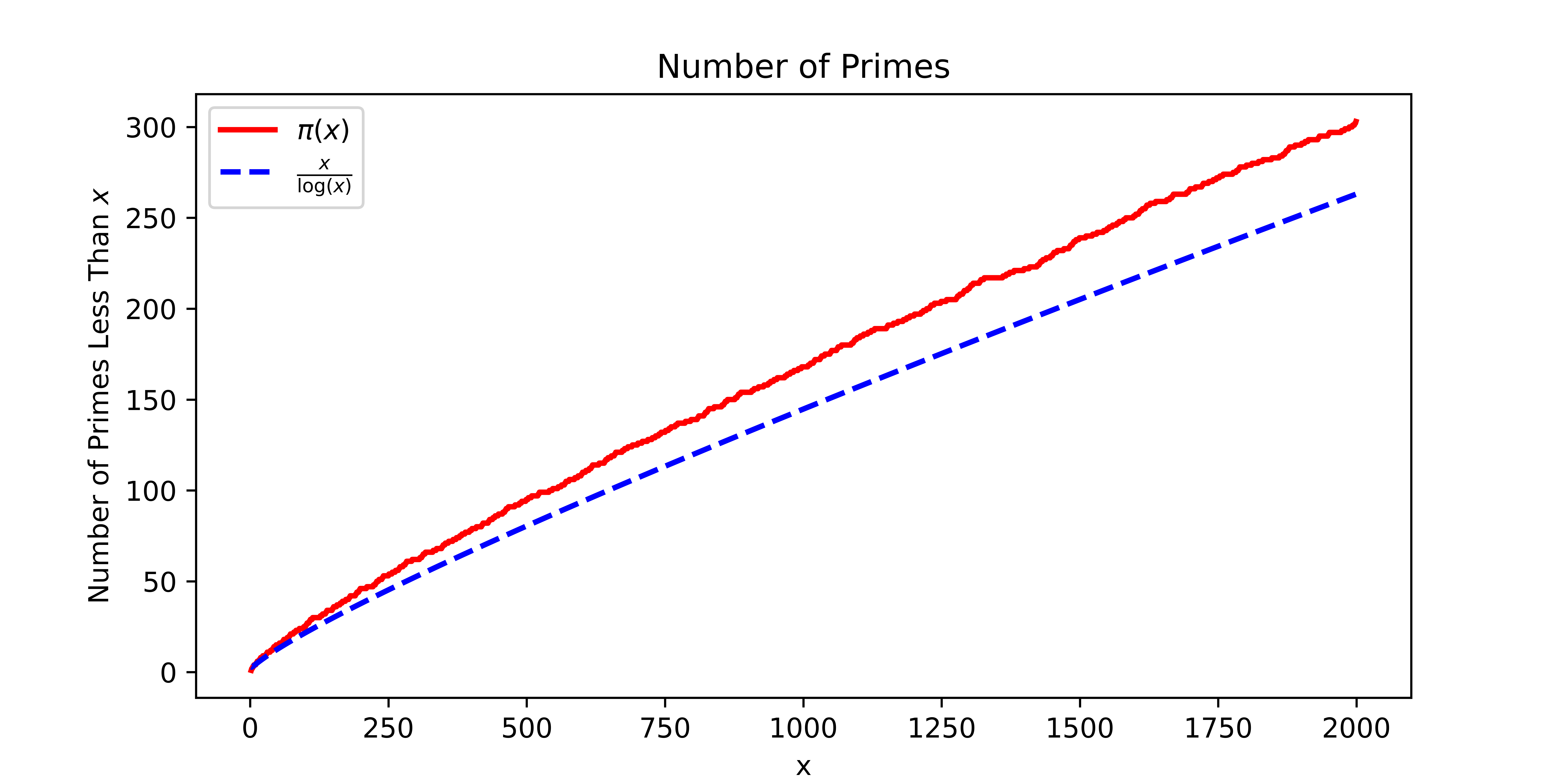 Here’s a naive algorithm for finding primes: Pick a random large number \(x\) and check if it is prime. If it’s not prime, we repeat. Surprisingly, this algorithm works! The reason it works is because there are lots of primes even among large numbers. The prime number theorem formalizes this statement.