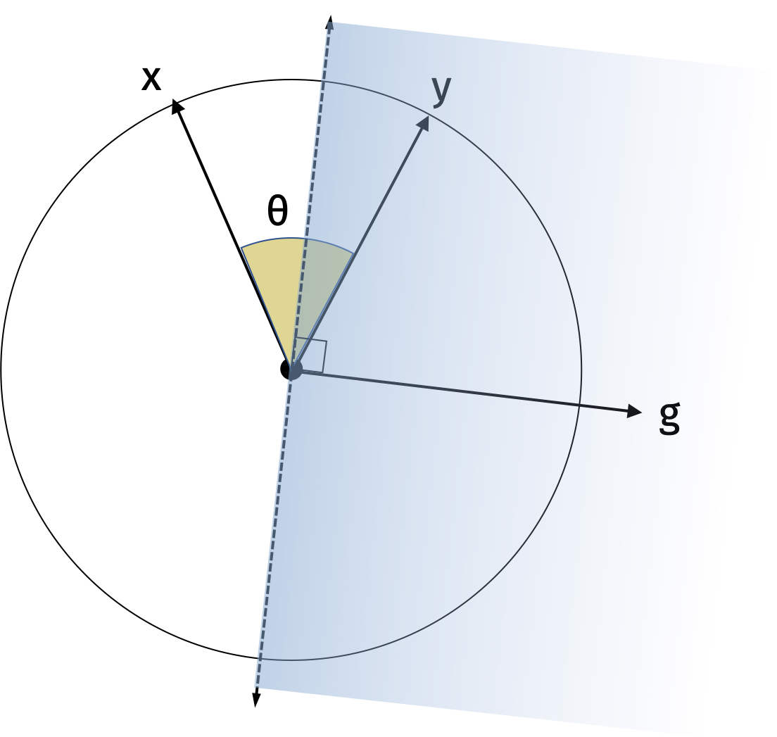 We will first show the result in one dimension. Consider the random vector \(\mathbf{g}\) and its hyperplane. Since it is drawn from the standard normal distribution, the direction of \(\mathbf{g}\) is uniformly distributed around the unit circle. Similarly, the hyperplane is also uniformly distributed around the unit circle. The sign of the inner product \(\langle \mathbf{g}, \mathbf{x} \rangle\) specifies which side of the hyperplane \(\mathbf{x}\) is on. Intuitively, the probability that \(\mathbf{x}\) and \(\mathbf{y}\) are on the same side of the hyperplane is proportional to their angle. We can make this formal with the following visualization.