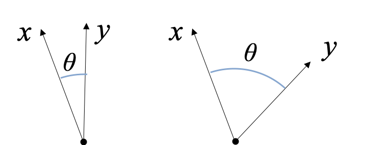 We can think of cosine similarity as a natural “inverse” for Euclidean distance. Suppose \(\mathbf{x}\) and \(\mathbf{y}\) are unit vectors. Then we have \[\begin{align*} \| \mathbf{x} - \mathbf{y} \|_2^2 &= \langle \mathbf{x} - \mathbf{y}, \mathbf{x} - \mathbf{y} \rangle \\ &= \| \mathbf{x} \|_2^2 + \| \mathbf{y} \|_2^2 - 2 \langle \mathbf{x}, \mathbf{y} \rangle = 2 - 2 \cos(\theta(\mathbf{x}, \mathbf{y})). \end{align*}\]
