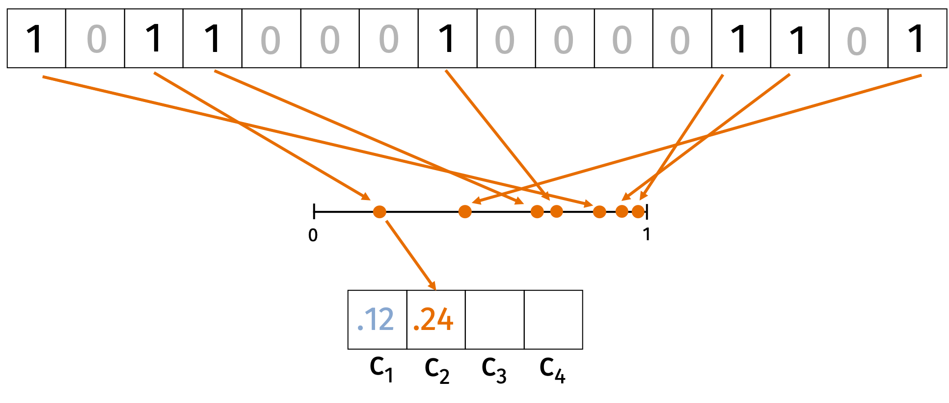 Consider an input \(\mathbf{x} \in \{0,1\}^d\). We start by choosing \(k\) random hash functions \(h_i: \{0, \ldots, d\} \rightarrow [0,1]\) for \(i \in [k]\). For each hash function \(h_i\) we’ll compute \[\begin{align*} c_i = \min_{j \in \{1, \ldots, d\}: \mathbf{x}_j = 1} h_i(j). \end{align*}\] In words, we hash each index where \(\mathbf{x}\) is non-zero to a random value in \([0,1]\). Then we take the minimum value of the hash function over all the non-zero indices. We call the compression \(C(\mathbf{x}) = (c_1, \ldots, c_k)\). We can see this process represented in the figure below.