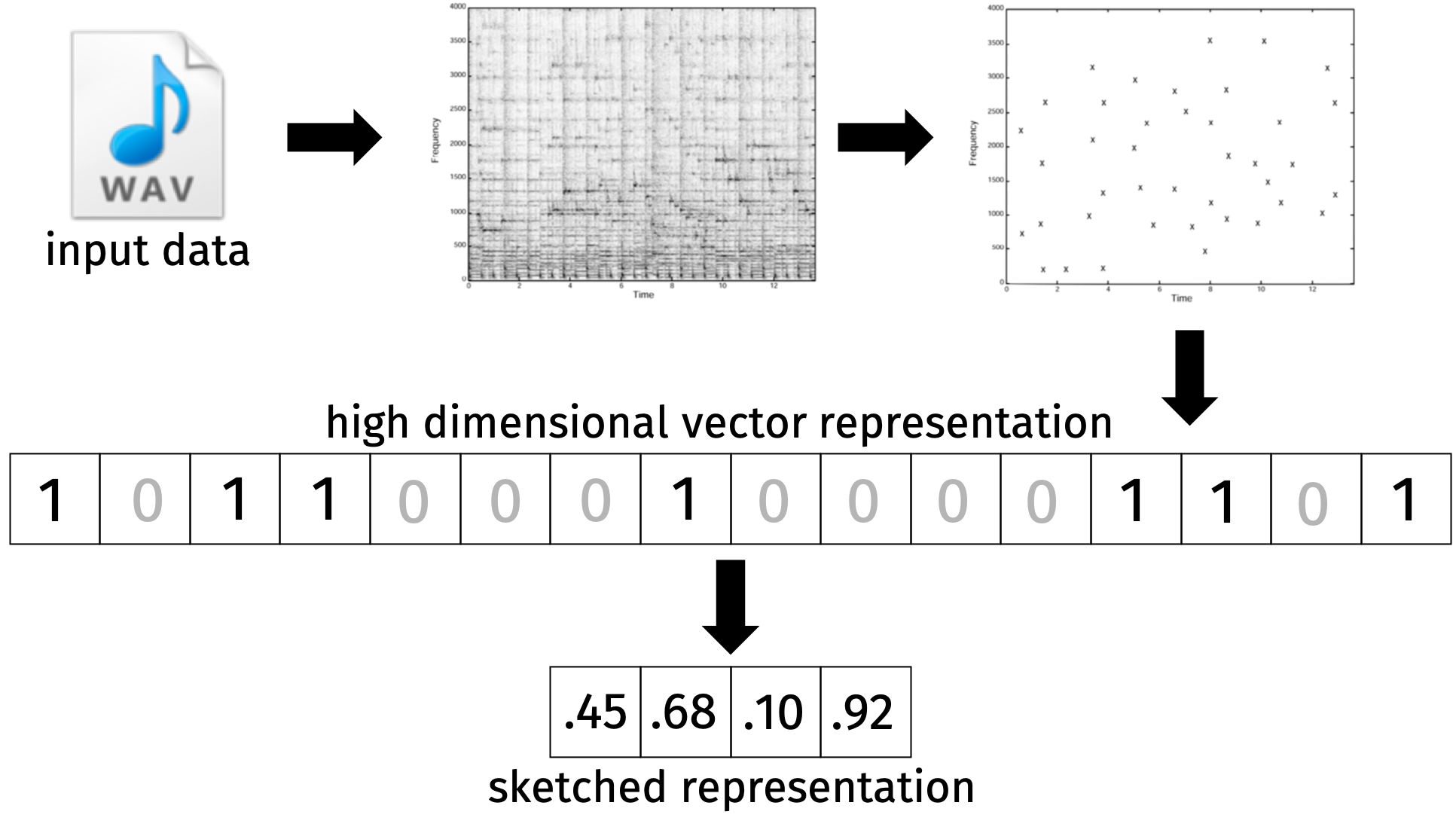 The process is a little more challenging because song clips may be slightly off set from the song clips in our database. In order to make the method work, they use anchor points to align the song clips. But, for our purposes, we are primarily interested in how we can compress the high-dimensional binary vector.