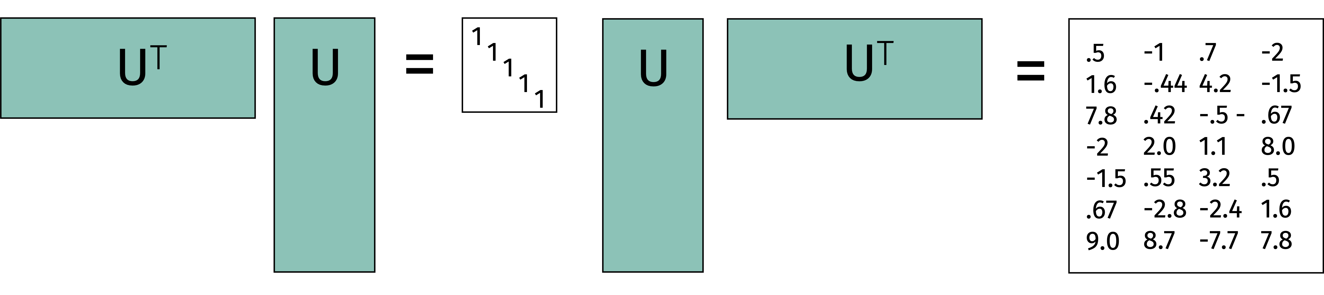 Similarly, for any \(\mathbf{x}\), \(\| \mathbf{U x}\|_2^2 = \| \mathbf{x} \|_2^2\) but \(\| \mathbf{U}^\top \mathbf{x} \|_2^2 \neq \| \mathbf{x} \|_2^2\).