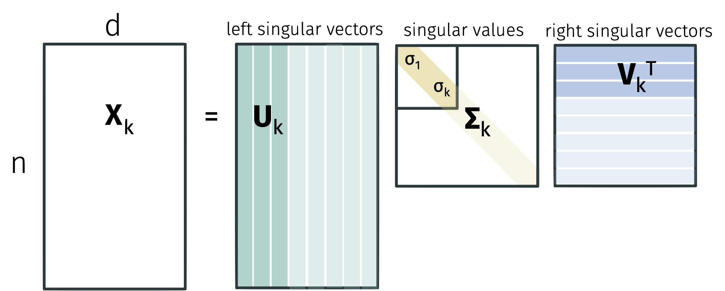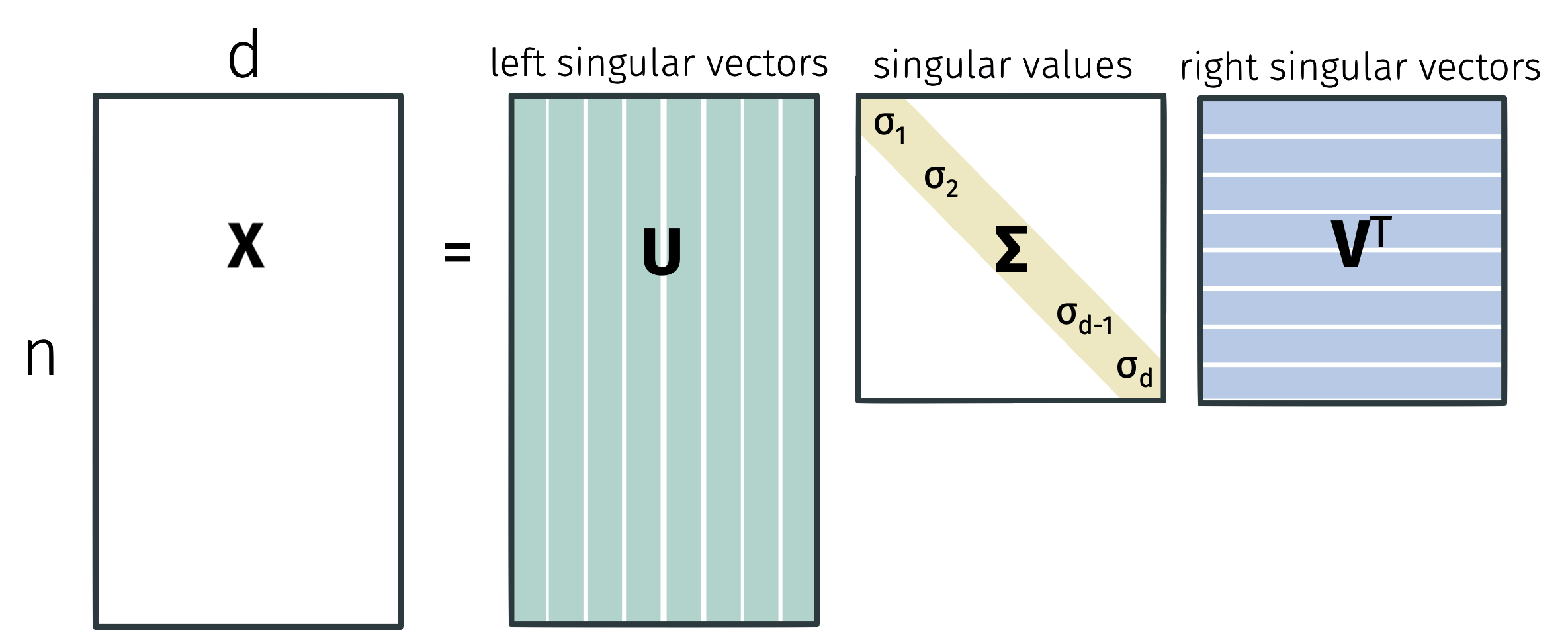 Singular value decomposition is one of the most fundamental results in linear algebra. Without loss of generality, suppose that \(n \geq d\). Any matrix \(\mathbf{X} \in \mathbb{R}^{n \times d}\) can be written in the form \[ \mathbf{X} = \mathbf{U} \mathbf{\Sigma} \mathbf{V}^\top \] where \(\mathbf{U} \in \mathbb{R}^{n \times d}\), \(\mathbf{\Sigma} \in \mathbb{R}^{d \times d}\), and \(\mathbf{V} \in \mathbb{R}^{d \times d}\). The matrix \(\mathbf{U}\) satisfies \(\mathbf{U}^\top \mathbf{U} = \mathbf{I}\) while \(\mathbf{V}\) satisfies \(\mathbf{V}^\top \mathbf{V} = \mathbf{I}\). The matrix \(\mathbf{\Sigma}\) is diagonal with non-negative entries \(\sigma_1 \geq \sigma_2 \geq \ldots \geq \sigma_d \geq 0\).