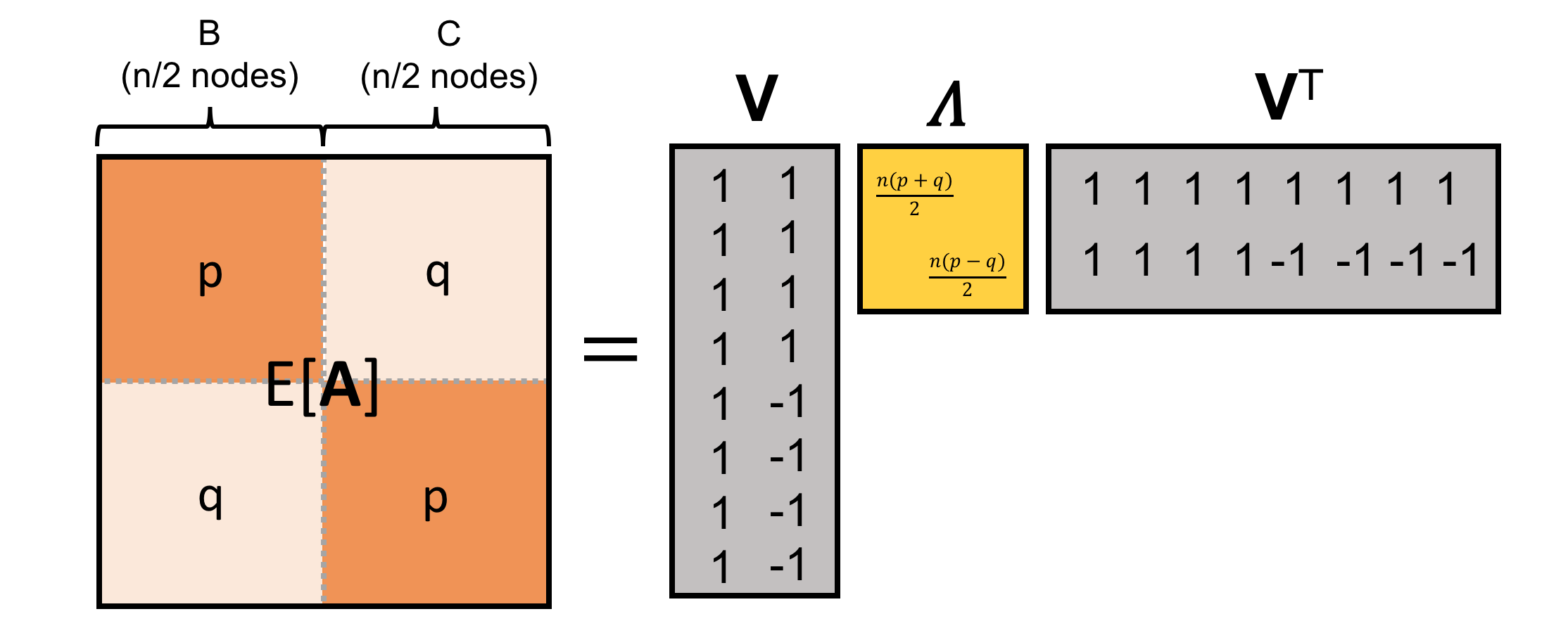 We will use the simplicity of the expected adjacency matrix to understand the eigenvectors of the expected Laplacian matrix. The top eigenvector \(\mathbf{v}_1\) is proportional to the vector \(\mathbf{1}\) with the eigenvalue \(\lambda_1 = \frac{(p+q)n}{2}\). The second eigenvector \(\mathbf{v}_2\) is the cut indicator for groups \(B\) and \(C\) with eigenvalue \(\lambda_2 = \frac{(p-q)n}{2}\). We can check that the eigendecomposition is correct because there are only two eigenvectors.