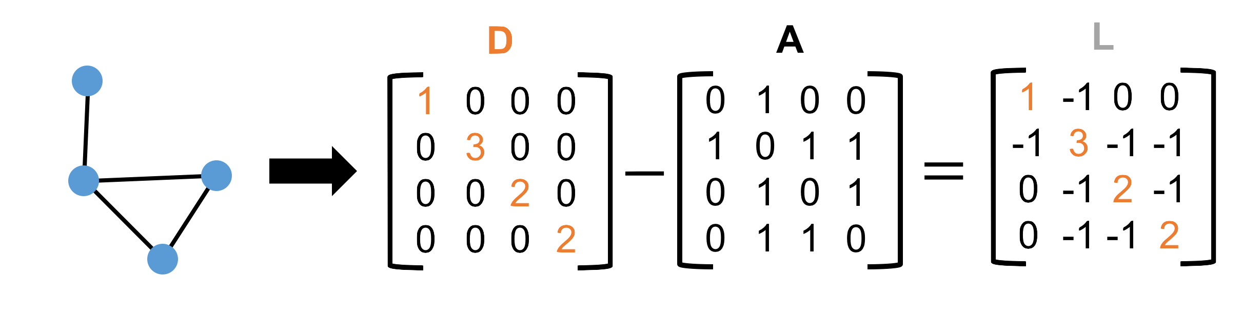 It is also common to look at normalized versions of both matrices \[ \bar{\mathbf{A}} = \mathbf{D}^{-1/2} \mathbf{AD}^{-1/2} \qquad \mathbf{L} = \mathbf{I} - \bar{\mathbf{A}}. \]