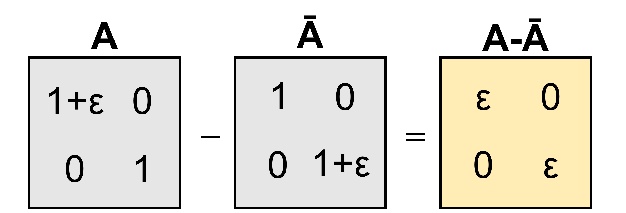 We can exhibit a matrix where the bound is tight. Let \(\mathbf{A}\) and \(\bar{\mathbf{A}}\) be the matrices in the figure below. The top eigenvector \(\mathbf{v}_1\) is \([1,0]\) whereas the top eigenvector \(\bar{\mathbf{v}}_1\) is \([0,1]\). The angle between these two vectors is \(\frac{\pi}{2}\) so \(\sin(\theta(\mathbf{v}_1, \bar{\mathbf{v}}_1)) = 1\). Since \(\lambda_1 = 1+\epsilon\) and \(\lambda_2 = 1\), the bound gives \(\frac{\epsilon}{\epsilon} = 1\).