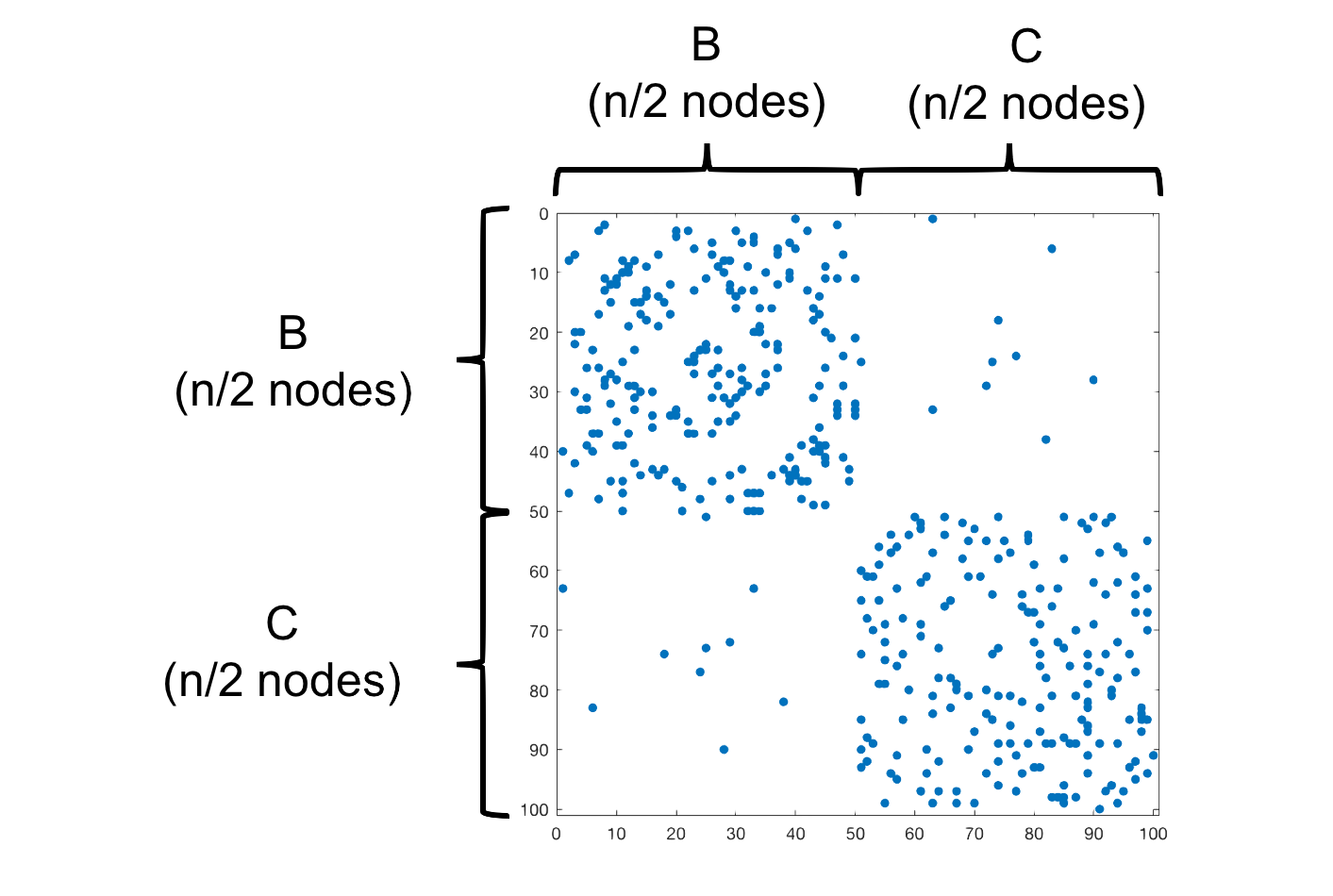 Note that we ordered the nodes in the adjacency matrix given in the figure. In reality, the order of the nodes would be “scrambled” and the blocks would not be so obvious.