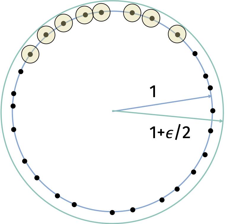 We can count the number of points in the \(\epsilon\)-net by considering the volume of the sphere. Each point in the net is at least \(\epsilon\) away from every other point in the net (otherwise, the point would not have been added). So we can imagine a ball of radius \(\frac{\epsilon}{2}\) around each point in the net that does not overlap with any other ball. All of these balls live in a larger ball of radius \(1+\frac{\epsilon}{2}\). Let’s count the number of non-overlapping balls of radius \(\frac{\epsilon}{2}\) that fit in the larger ball of radius \(1+\frac{\epsilon}{2}\). We know that the volume of a ball with radius \(r\) in \(d\) dimensions is \[ \text{vol}(d,r) = c \cdot r^d \] where \(c\) is a constant that depends on the dimension but not on the radius.