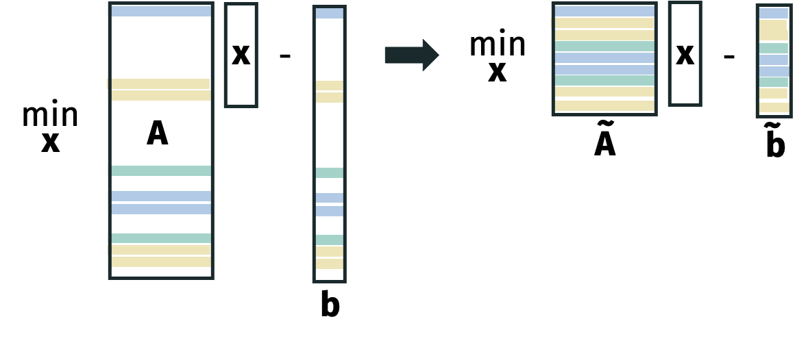Consider the optimal solution to the least squares problem \[ \mathbf{x}^* = \arg \min_{\mathbf{x} \in \mathbb{R}^d} \| \mathbf{A} \mathbf{x} - \mathbf{b} \|_2^2 \] and the approximate solution \[ \tilde{\mathbf{x}} = \arg \min_{\mathbf{x} \in \mathbb{R}^d} \| \mathbf{\Pi} \mathbf{A} \mathbf{x} - \mathbf{\Pi} \mathbf{b} \|_2^2 \]